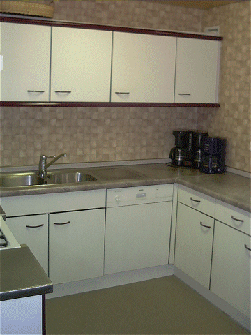 Einbauküche komplett mit Geschirr, Kühl- u. Gefrierschrank, großer Gasherd mit Backofen, Profi-Spülmaschine, Kaffeemaschinen |